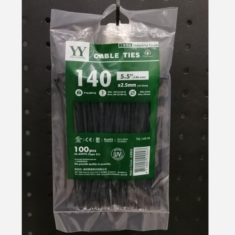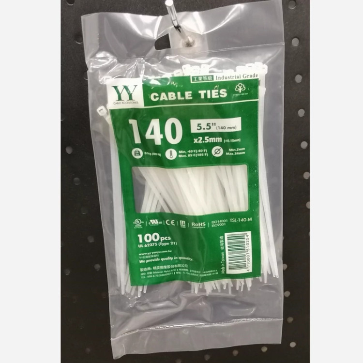 بست کمربندی 140mm*2/5mm صد عددی، برند YY، ساخت تایوان، کیفیت فوق العاده عالی، دارای استاندارد ها و گواهینامه های CE,ROSH,DNV-GL, ISO14001,ISO9001 , آستانه تحمل فشار 8کیلوگرمی، مقاومت دمایی 40_ الی 85 درجه سانتی گراد،در دو رنگ سفید و مشکی.