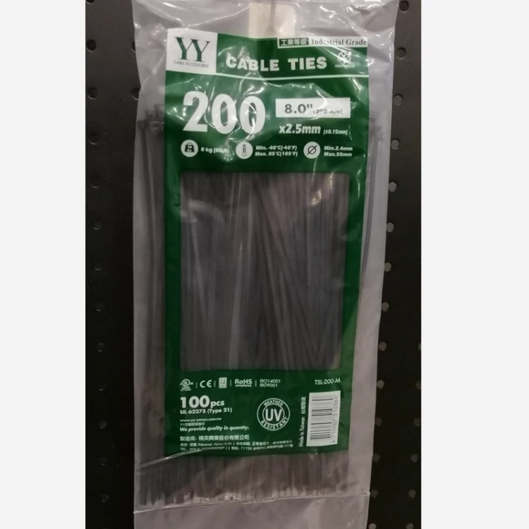 بست کمربندی 200mm*2/5mm صد عددی،برند YY، ساخت تایوان، کیفیت فوق العاده عالی، دارای استاندارد ها و گواهینامه های CE,ROSH,DNV-GL, ISO14001,ISO9001 , آستانه تحمل فشار 8کیلوگرمی، مقاومت دمایی 40_ الی 85 درجه سانتی گراد،در دو رنگ سفید و مشکی.