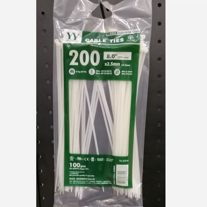 بست کمربندی 200mm*2/5mm صد عددی،برند YY، ساخت تایوان، کیفیت فوق العاده عالی، دارای استاندارد ها و گواهینامه های CE,ROSH,DNV-GL, ISO14001,ISO9001 , آستانه تحمل فشار 8کیلوگرمی، مقاومت دمایی 40_ الی 85 درجه سانتی گراد،در دو رنگ سفید و مشکی.