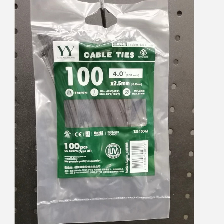 بست کمربندی 100mm*2/5mm صد عددی، برند YY، ساخت تایوان، کیفیت فوق العاده عالی، دارای استاندارد ها و گواهینامه های CE,ROSH,DNV-GL, ISO14001,ISO9001 , آستانه تحمل فشار 8کیلوگرمی، مقاومت دمایی 40_ الی 85 درجه سانتی گراد،در دو رنگ سفید و مشکی.